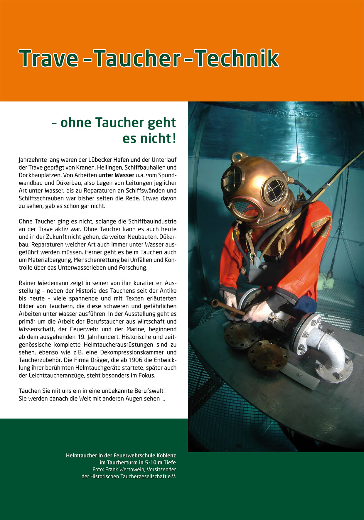 Rainer Wiedemann zeigt in seiner von ihm kuratierten Ausstellung - neben der Historie des Tauchens seit der Antike bis heute – viele spannende und mit Texten erläuterten Bilder von Tauchern, die diese schweren und gefährlichen Arbeiten unter Wasser ausführen. In der Ausstellung geht es primär um die Arbeit der Berufstaucher aus Wirtschaft und Wissenschaft, der Feuerwehr und der Marine, beginnend ab dem ausgehenden 19. Jahrhundert. Historische und zeitgenössische komplette Helmtaucherausrüstungen sind zu sehen, ebenso wie z.B. eine Dekompressionskammer und Taucherzubehör. Die Firma Dräger, die ab 1906 die Entwicklung ihrer berühmten Helmtauchgeräte startete, später auch der Leichttaucheranzüge, steht besonders im Fokus.